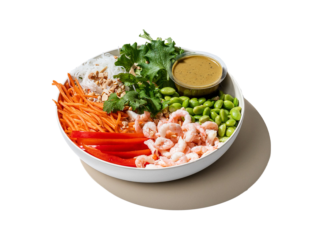 Handskalade räkor, glasnudlar, salladsmix, ingefärspicklad morot, paprika, edamamebönor, koriander, rostade jordnötter & habanero-limedressing.