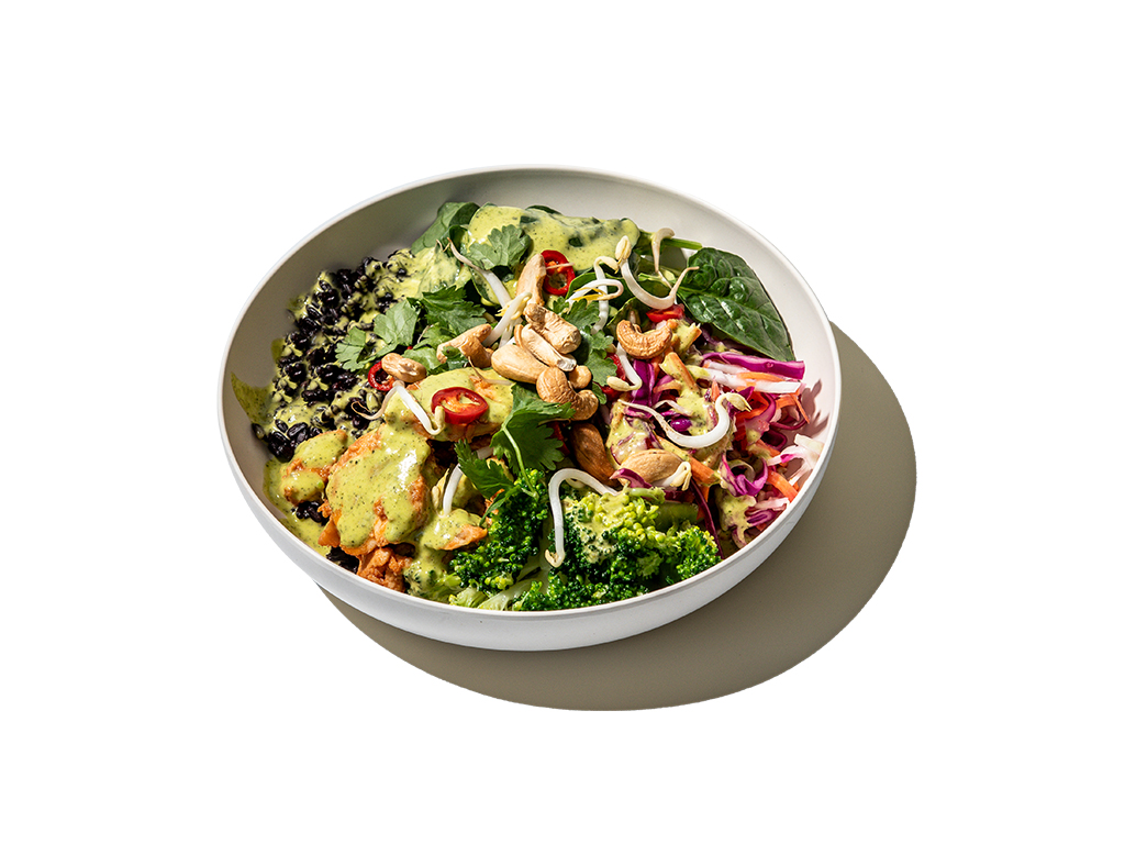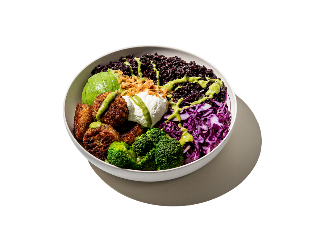 Välj mellan varm marinerad Bjärekyckling eller varma vegobites från Oh Mungood. Varmt svart råris, avokado, broccoliträd, rödkål, citroncrème, rostad schalottenlök & green-goddessdressing.
