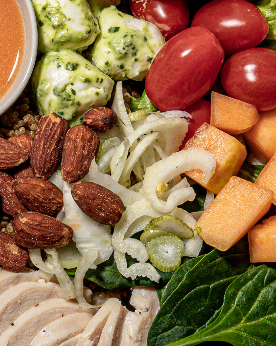 Bjärekyckling, vit quinoa, cantaloupemelon, marinerad mini mozzarella, picklad fänkål, spenat, babytomater, saltrostade mandlar & blodapelsinvinägrett*.