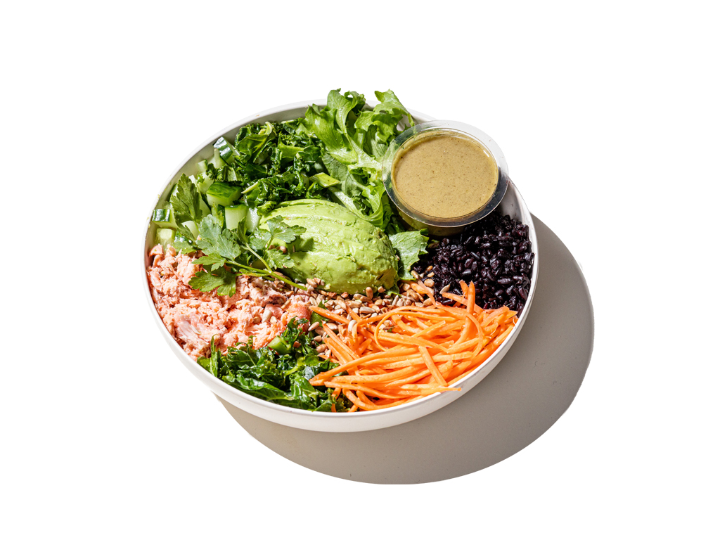 Vedugnseldad lax, salladsmix, svart råris, avokado, marinerad grönkål, ingefärspicklad morot, gurka, färsk svensk bladpersilja, rostade solroskärnor & basilika-citrondressing.