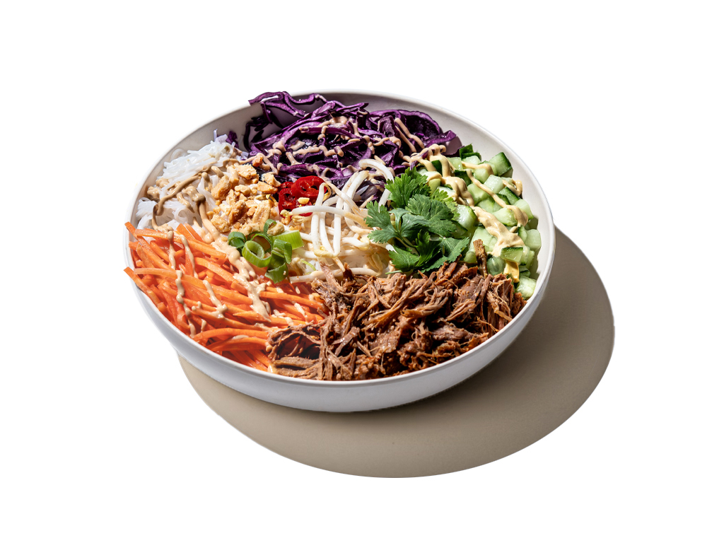 Välj mellan varmt svenskt långkokt nötkött eller varma vegobites från Oh Mungood. Varma glasnudlar, gurka, ingefärspicklad morot, rödkål, picklad röd chili, salladslök, böngroddar, koriander, rostade jordnötter & jordnöt-limedressing.